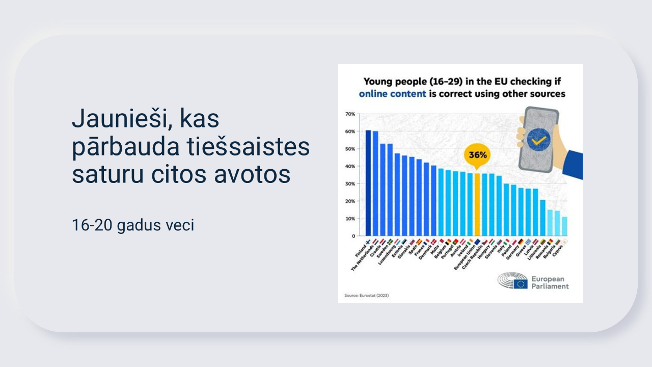 Eurostat datos (2023) redzams, ka tikai 36% ES jauniešu (16-20 gadus veci) pārbauda tiešsaistē saņemtās informācijas pareizību. Latvijā – vēl mazāk (ap 27–28%).